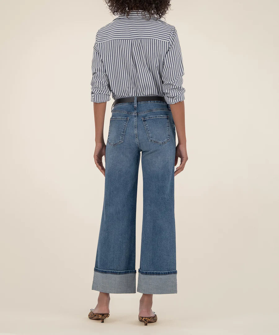 Elevate your everyday denim with these high rise Fab Ab wide leg jeans. Featuring a clean medium wash and a chic roll-up hem, they combine effortless style with a modern silhouette. Perfect for pairing with anything from sneakers to heels.