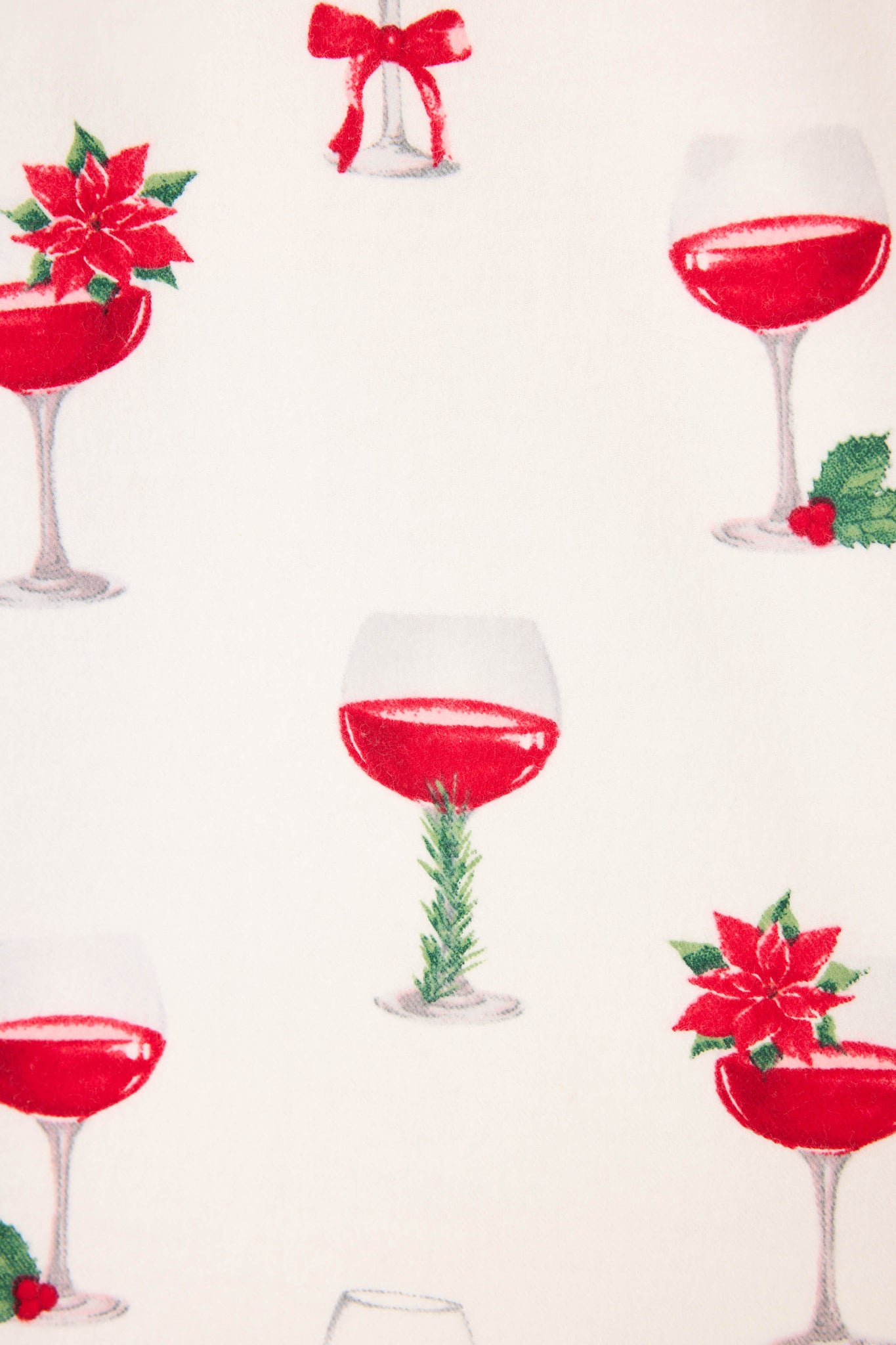Raise a glass to cozy season in this ivory cotton flannel pajama set, patterned with festive wine glasses topped with poinsettias, bows, and sprigs of holly. This plus-size three-piece design includes a button-down top finished with red piping, relaxed drawstring pants, and a matching headband—perfect for holiday happy hours, wrapping marathons, and fireside lounging.
