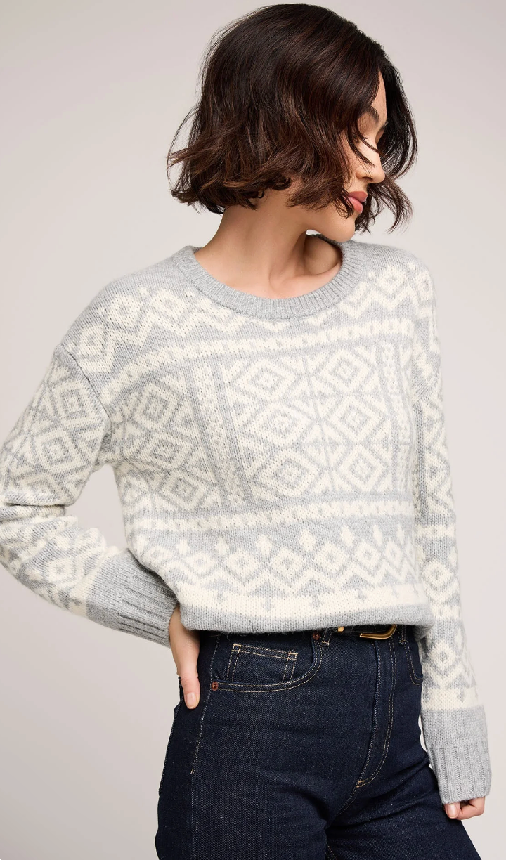 The Cypress sweater is made of a soft yarn with a jacquard knit pattern. Features include a crew neckline and wide ribbed sleeve cuff and hem band